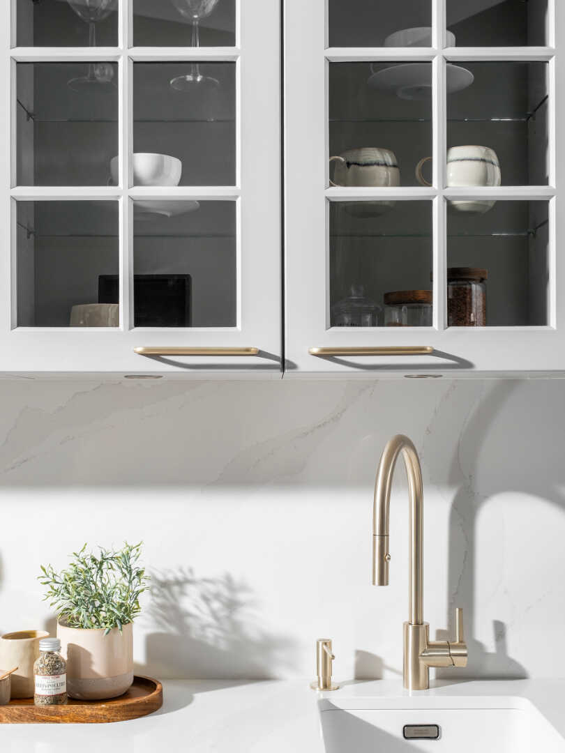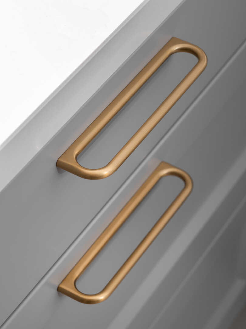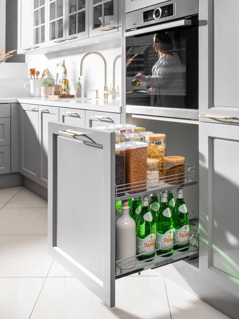 Tradycyjna forma ramiaków oraz doskonale wkomponowanych witryn, przełamane zostały poziomym układem złotych uchwytów, które nadają całości szyku i elegancji. Harmonijną bryłę w odcieniach delikatnej szarości. Dopełnieniem całości jest stylowa bateria, która podkreśla prosty lecz bardzo elegancki styl kuchni.