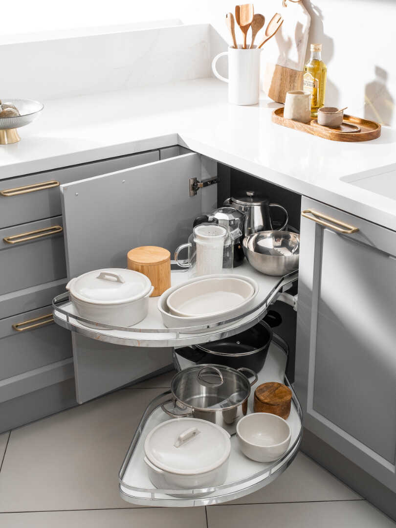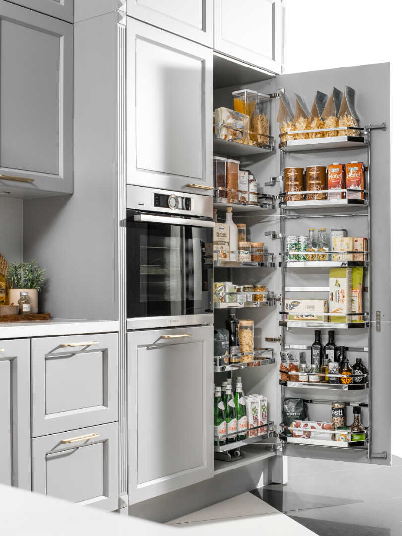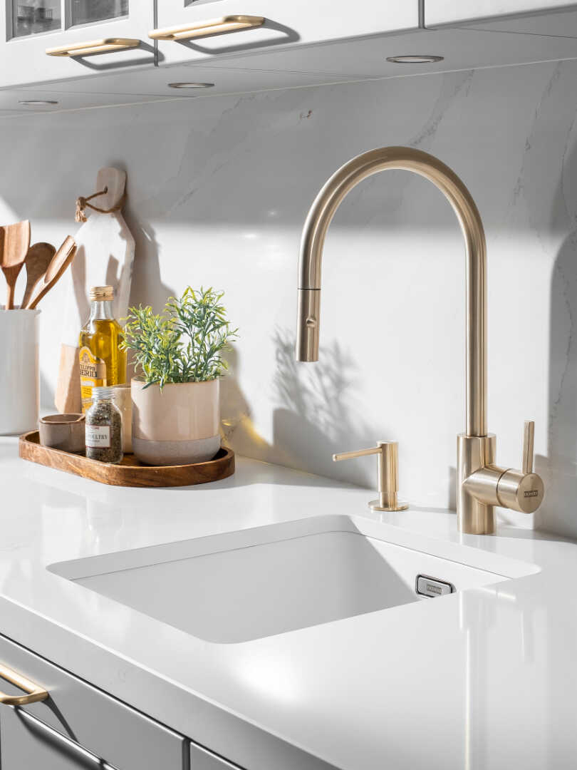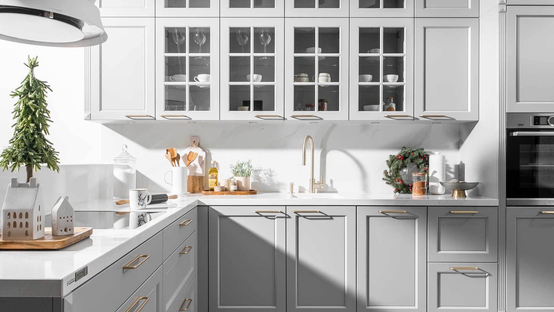 Tradycyjna forma ramiaków oraz doskonale wkomponowanych witryn, przełamane zostały poziomym układem złotych uchwytów, które nadają całości szyku i elegancji. Harmonijną bryłę w odcieniach delikatnej szarości. Dopełnieniem całości jest stylowa bateria, która podkreśla prosty lecz bardzo elegancki styl kuchni.