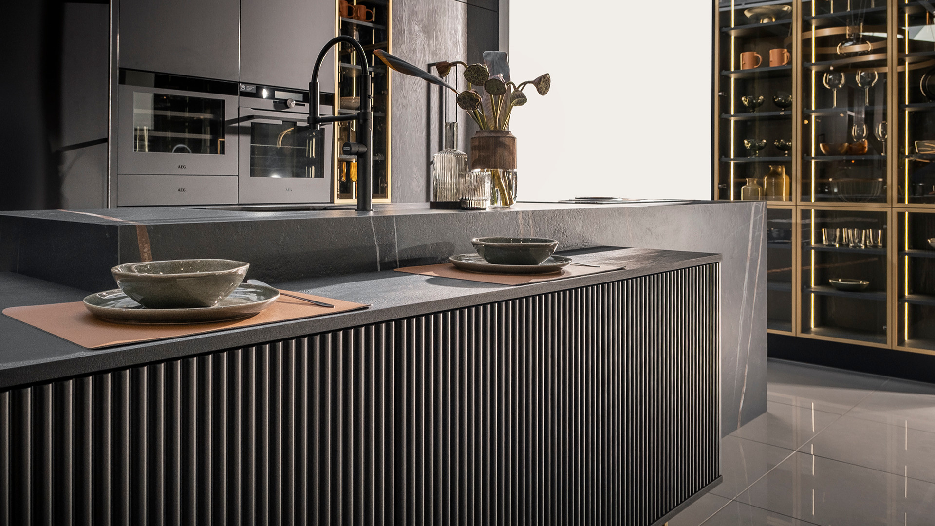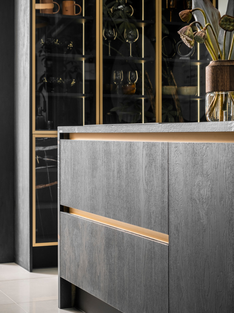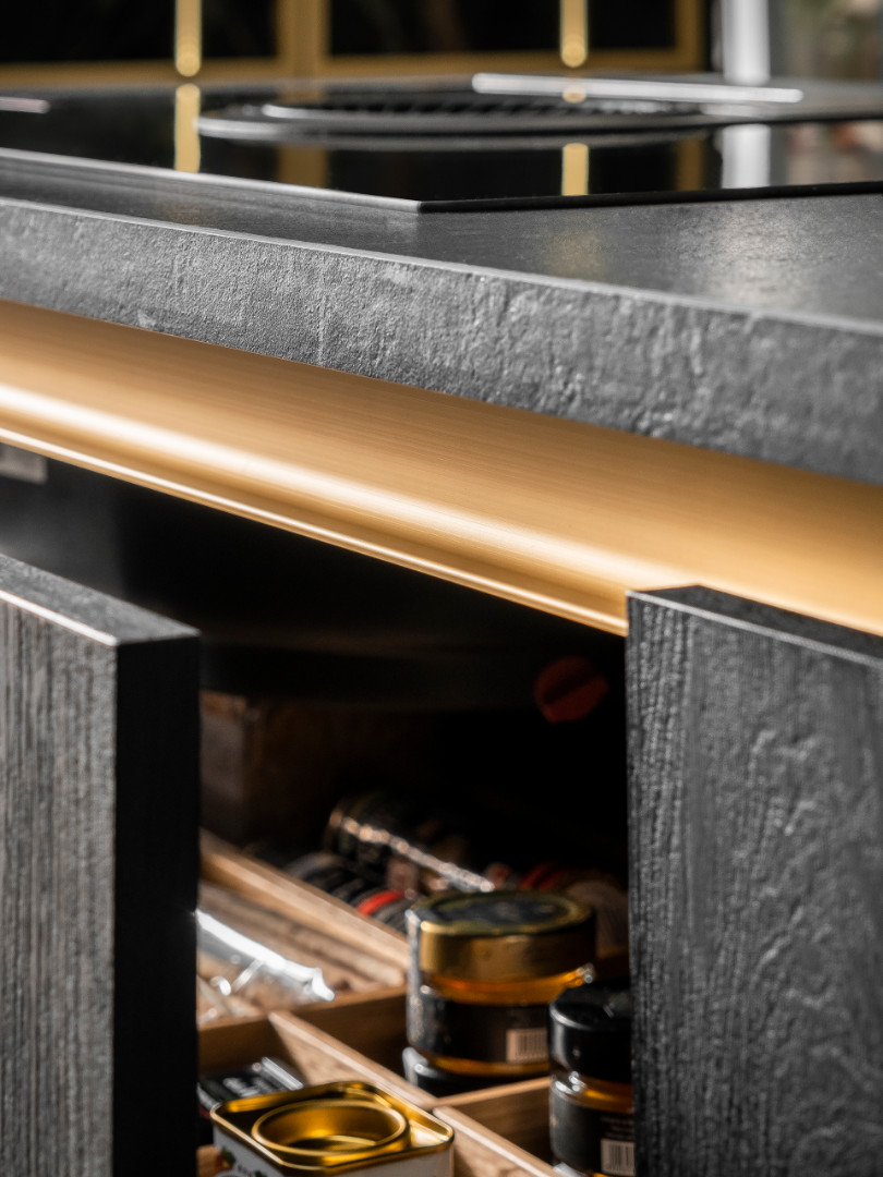 Stylowa aranżacja w kolorach czerni i złota nadaje całej zabudowie ogrom elegancji. Masywna wyspa ze spieku kwarcowego wykończona niestandardowym frontem ryflowanym, idealnie przełamuje prostą bryłę kuchni.