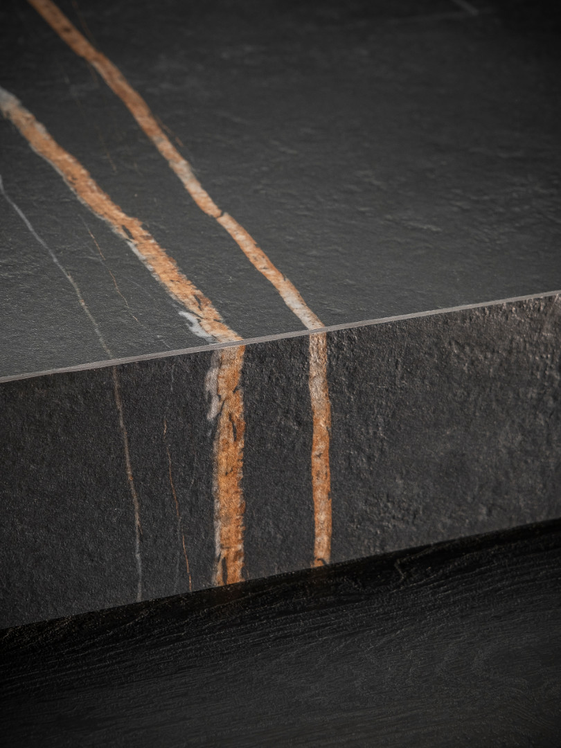 Solidny blat ze spieku kwarcowego w kolorze czerni i złota doskonale współgra z pozostałą częścia zabudowy.