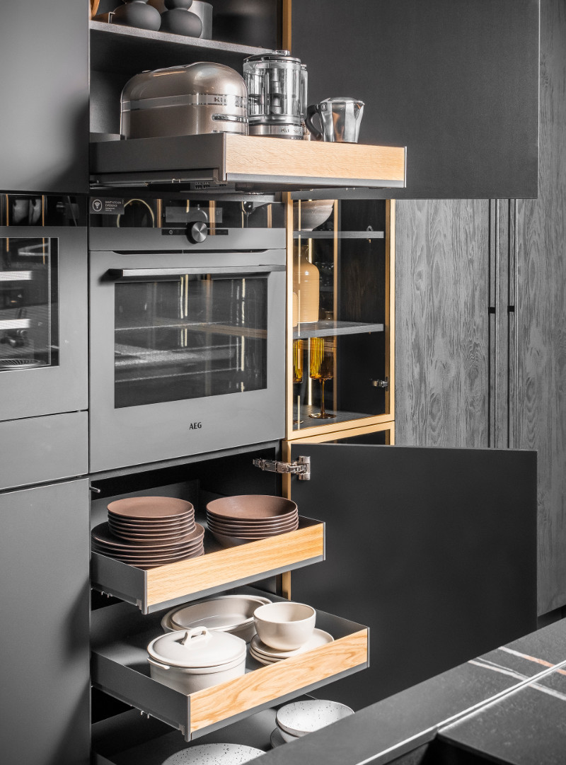 Ergonomiczne szuflady ukryte w zabudowie wyspy zapewniają łatwy i szybki dostęp do ich zawartości