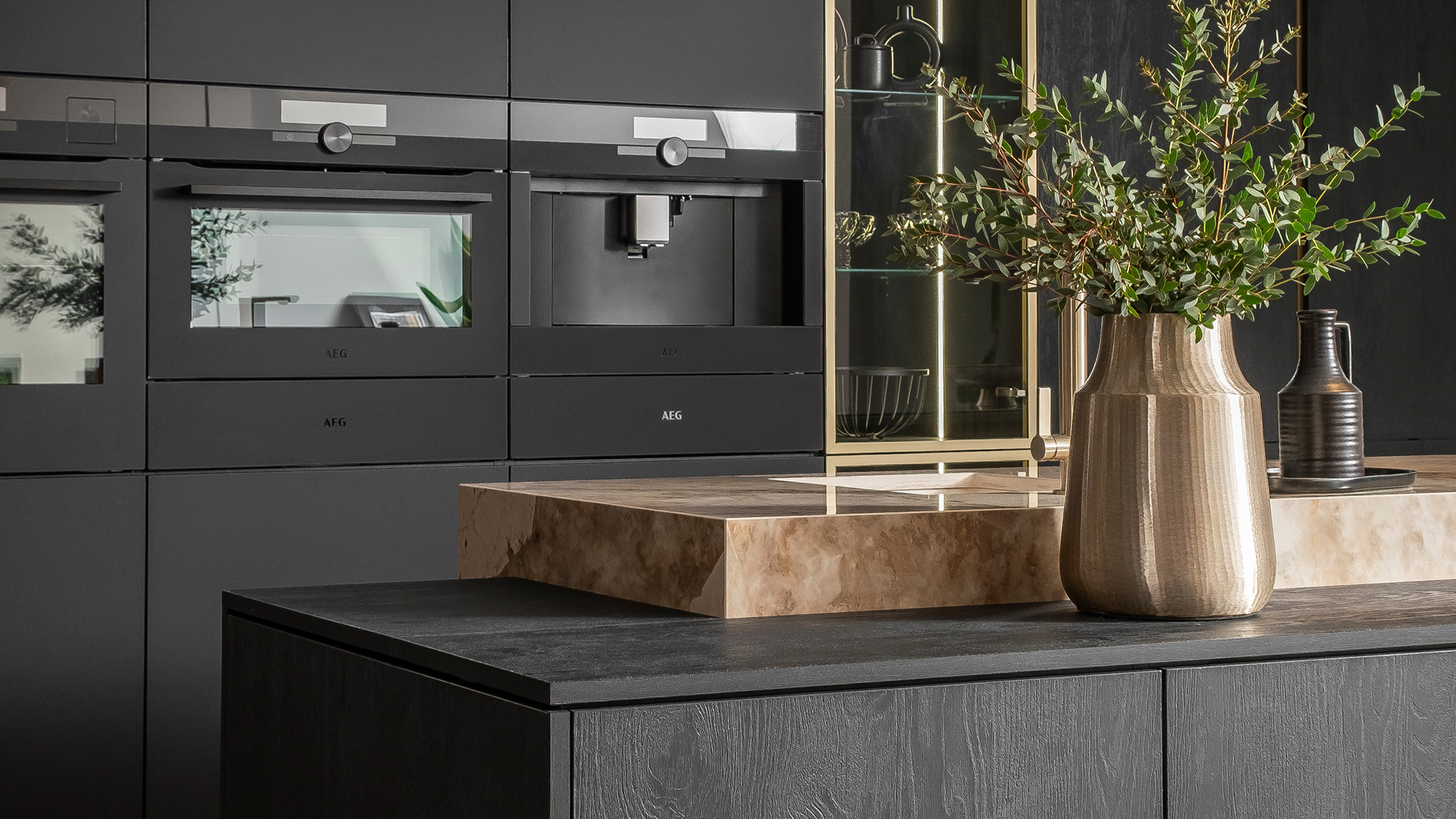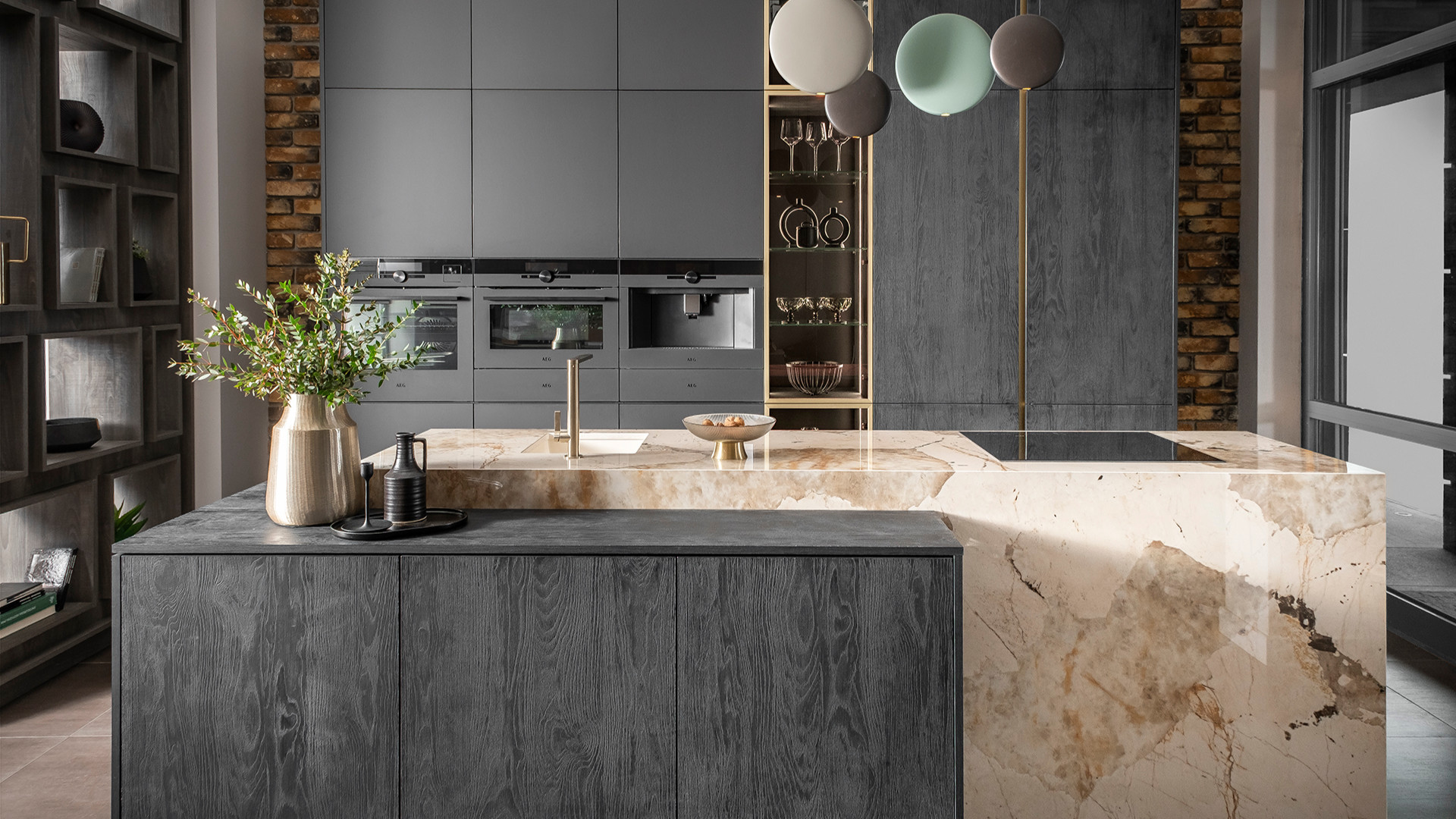 Duża, czysta przestrzeń pomieszczenia została zaaranżowana wysokimi szafami oraz centralnie umieszczoną wyspą, pełniącą rolę podstawowego blatu roboczego. Idealnie wkomponowana w bryłę kuchni witryna, elegancko prezentuje jej wnętrze, dając jednocześnie łatwy i szybki dostęp do całej zawartości, a wysokiej klasy sprzęt AGD zawsze jest w zasięgu Twojej ręki.