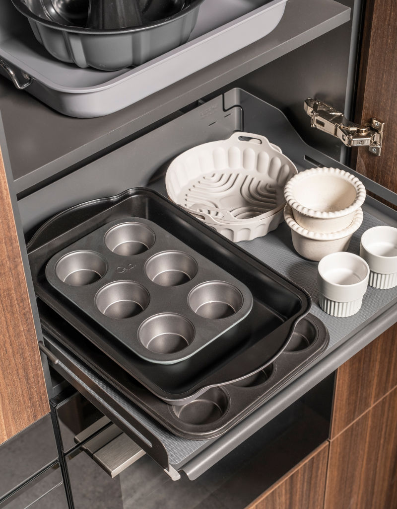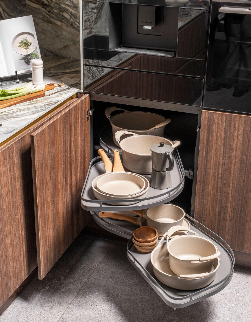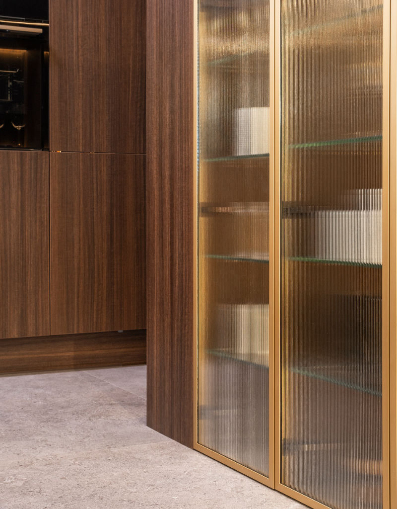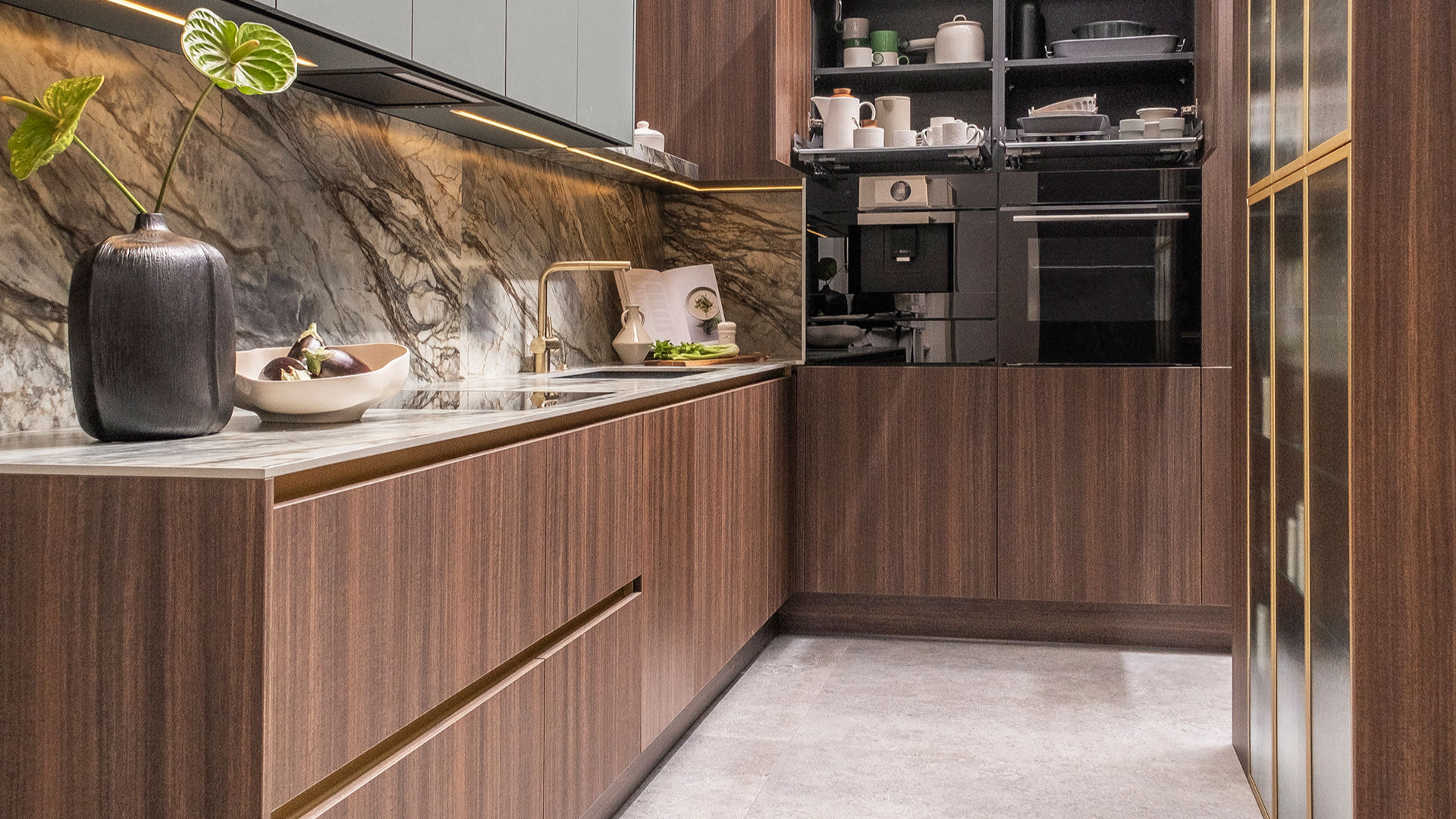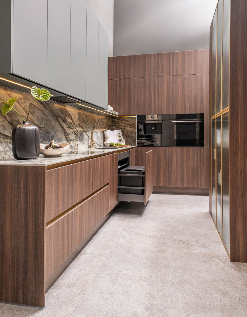 Ciepłe drewno w kawowym odcieniu, przełamane jasnym wykończeniem blatów oraz szafek dolnych, w połączeniu z czarnymi witrynami oraz półkami w stylu rustykalnym, nadają tej kuchni niesamowitej przejrzystości. Przemyślana architektura i odpowiedni dobór wyposażenia sprawiają, iż mimo stosunkowo niewielkich rozmiarów, znajdzie się tutaj miejsce na wszystkie niezbędne przybory kuchenne.