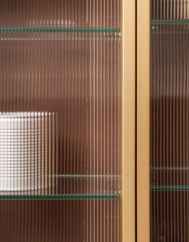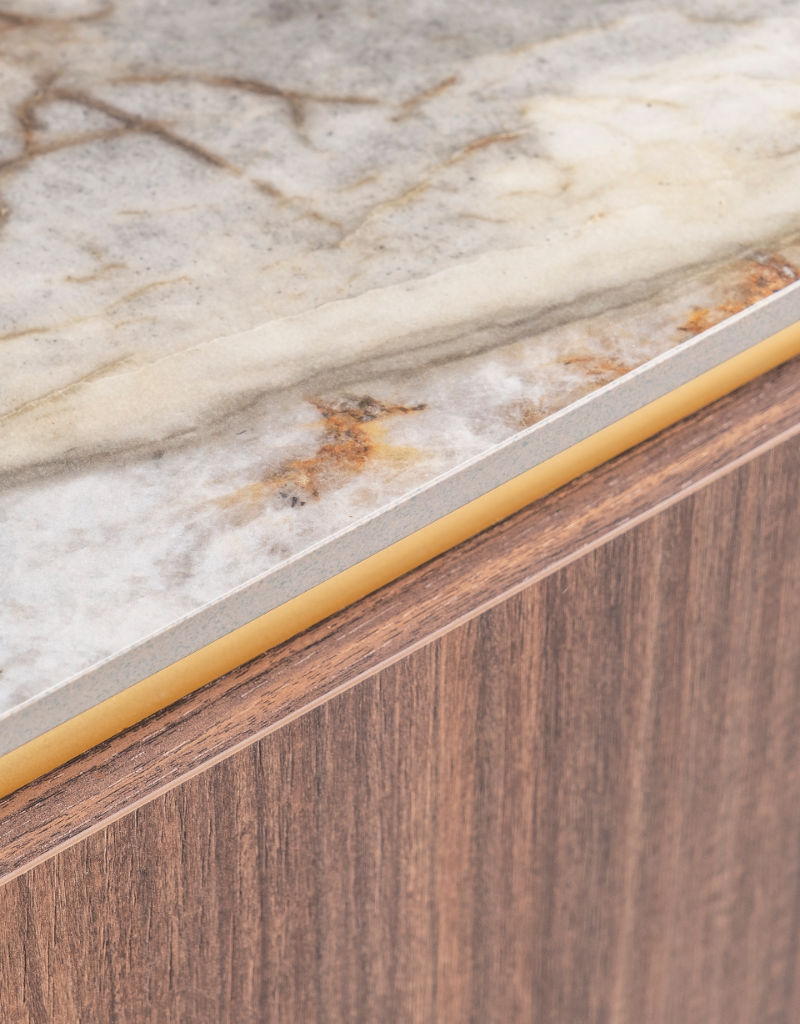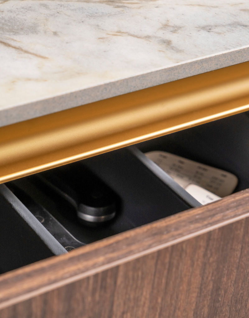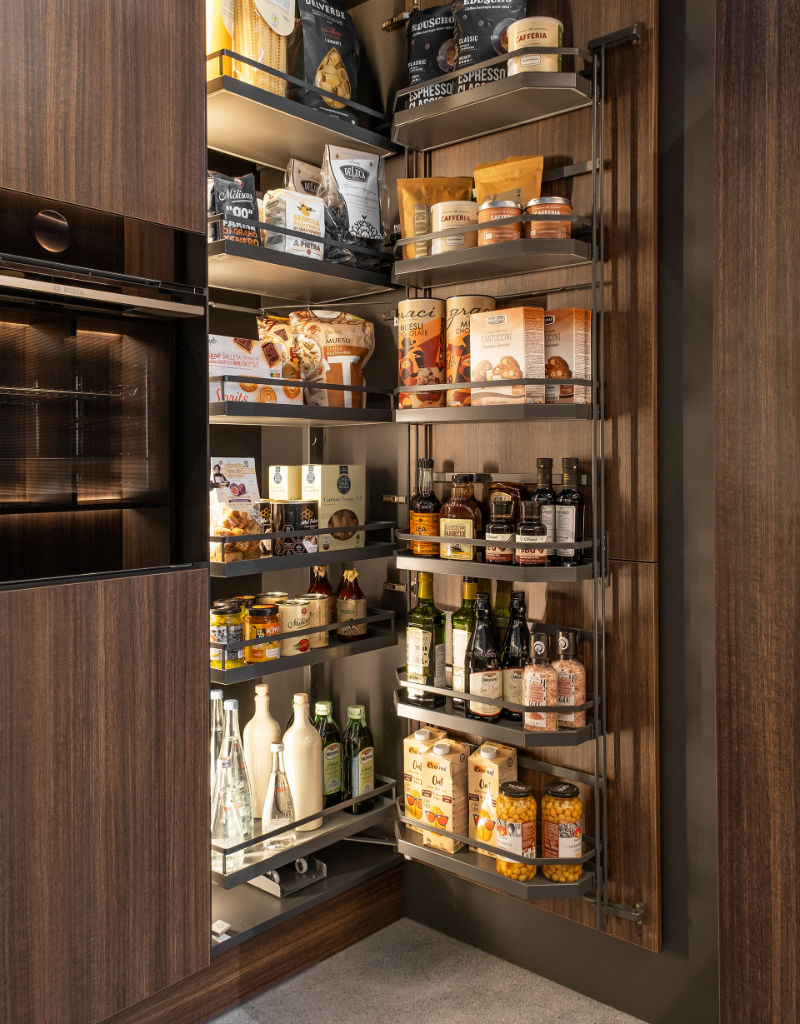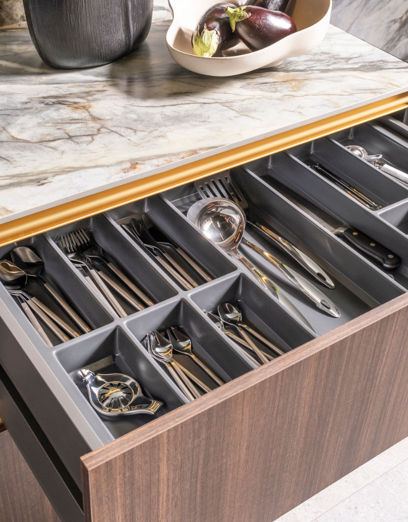 Ciepłe drewno w kawowym odcieniu, przełamane jasnym wykończeniem blatów oraz szafek dolnych, w połączeniu z czarnymi witrynami oraz półkami w stylu rustykalnym, nadają tej kuchni niesamowitej przejrzystości. Przemyślana architektura i odpowiedni dobór wyposażenia sprawiają, iż mimo stosunkowo niewielkich rozmiarów, znajdzie się tutaj miejsce na wszystkie niezbędne przybory kuchenne.
