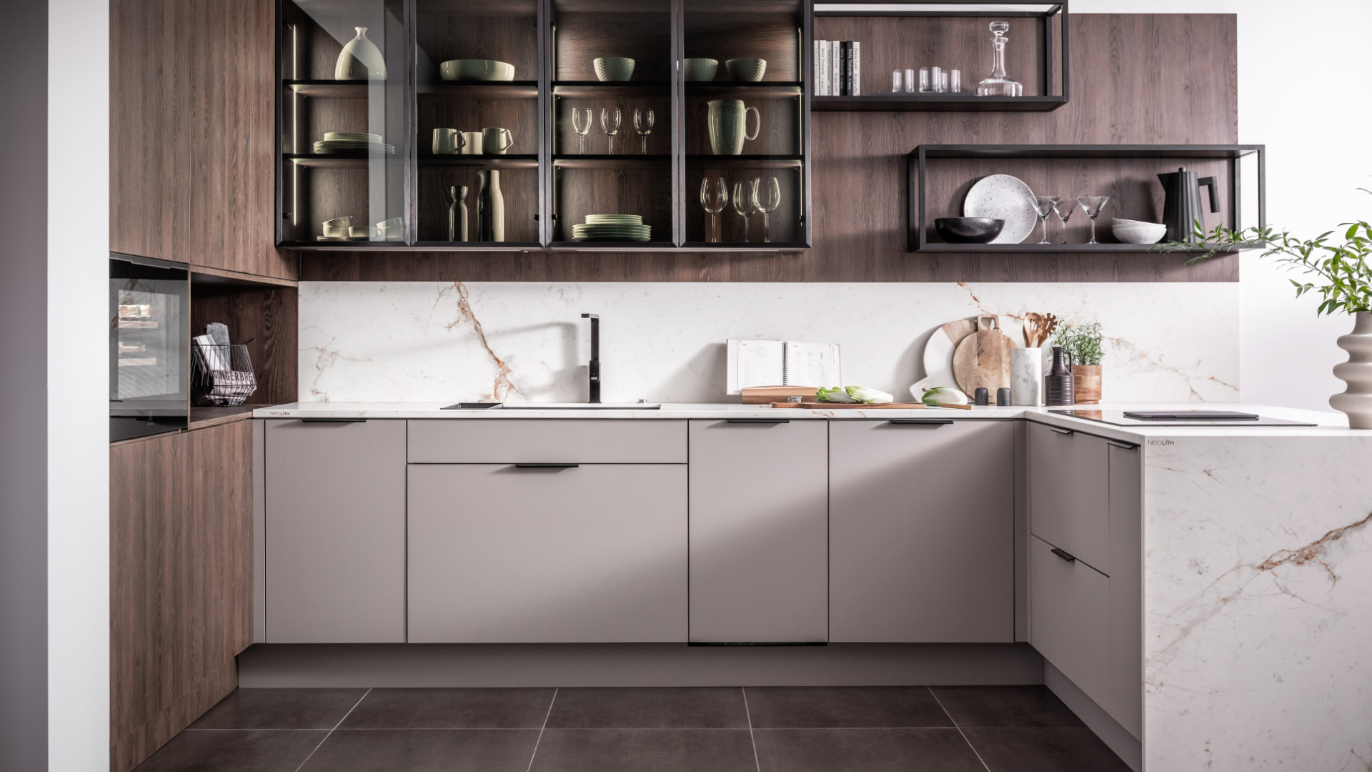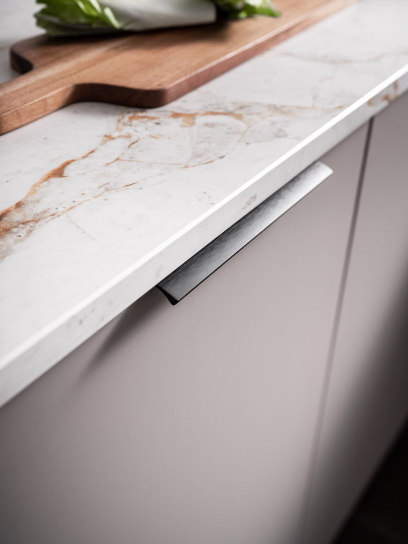 Delikatne, płaskie uchwyty idealnie współgrają z prostą bryłą kuchni.