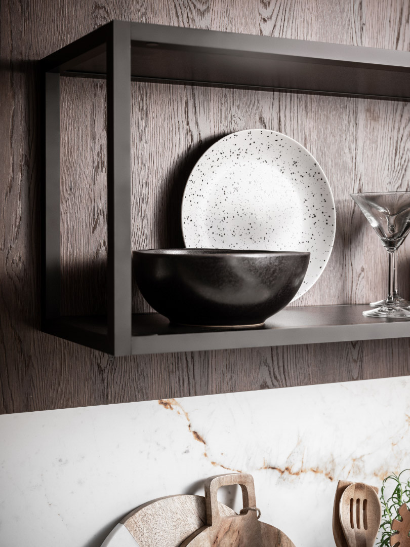 Ciepłe drewno w kawowym odcieniu, przełamane jasnym wykończeniem blatów oraz szafek dolnych, w połączeniu z czarnymi witrynami oraz półkami w stylu rustykalnym, nadają tej kuchni niesamowitej przejrzystości. Przemyślana architektura i odpowiedni dobór wyposażenia sprawiają, iż mimo stosunkowo niewielkich rozmiarów, znajdzie się tutaj miejsce na wszystkie niezbędne przybory kuchenne.