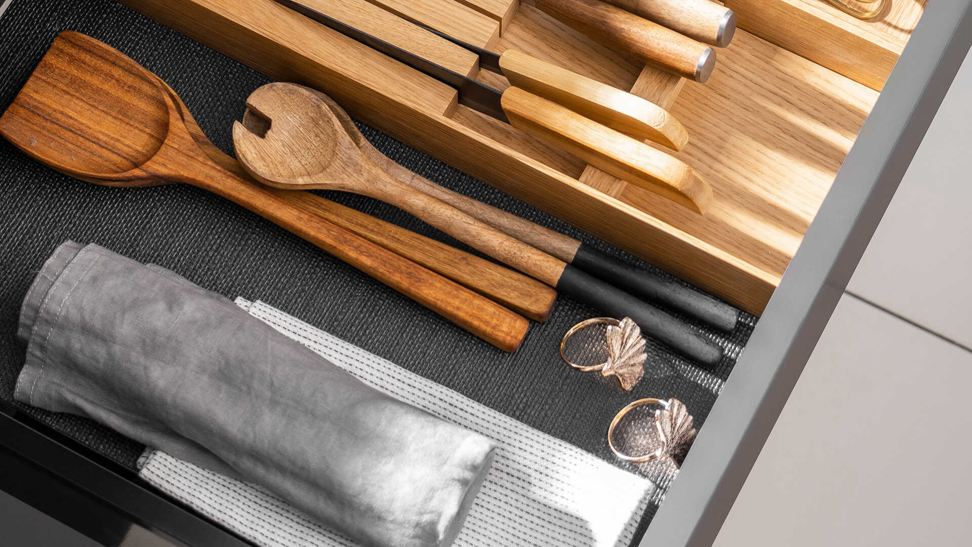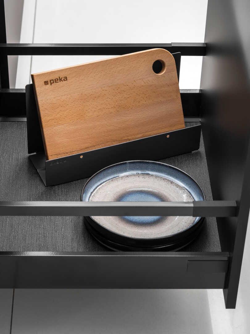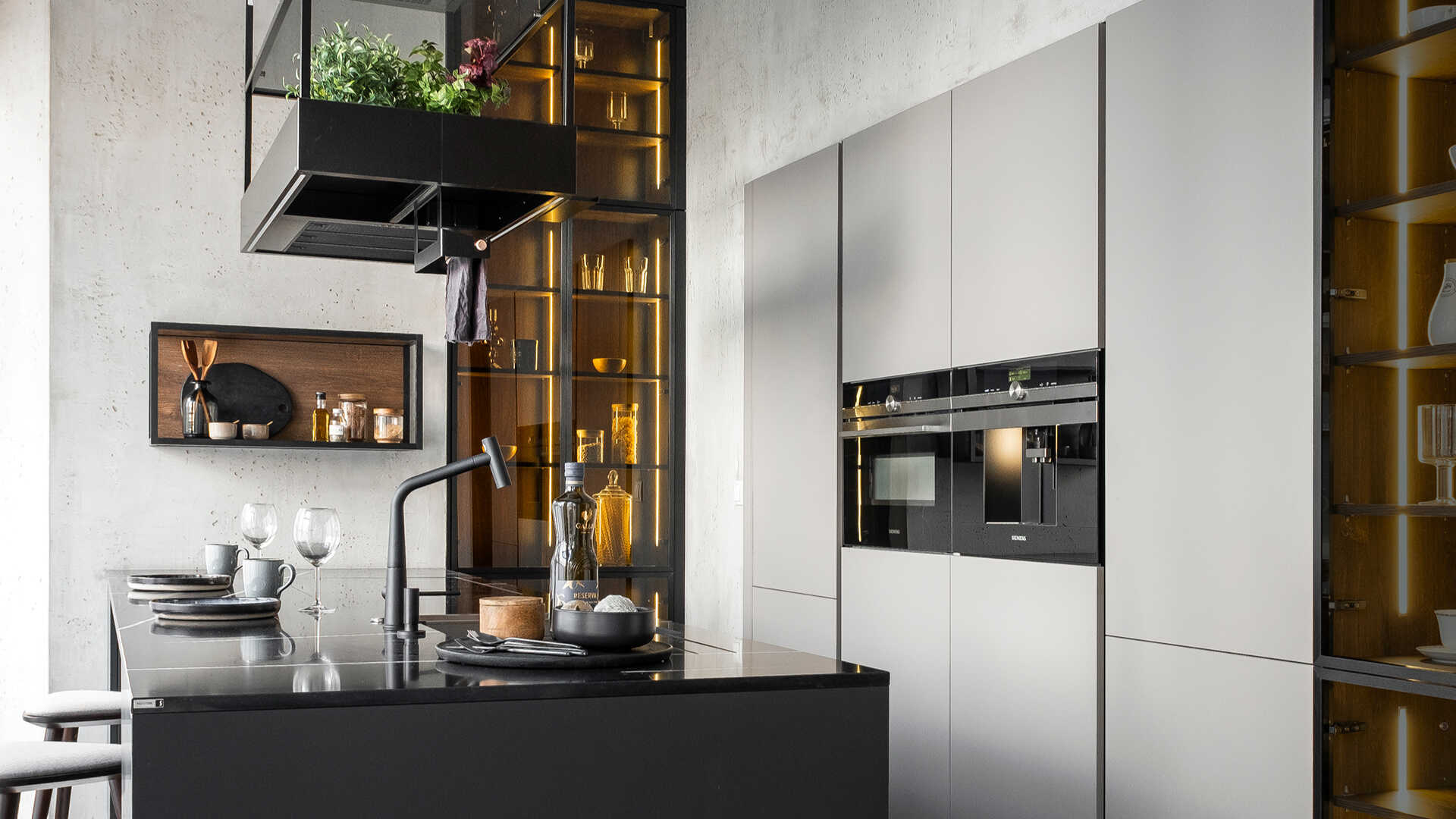 Duża, czysta przestrzeń pomieszczenia została zaaranżowana wysokimi szafami oraz centralnie umieszczoną wyspą, pełniącą rolę podstawowego blatu roboczego. Idealnie wkomponowane w bryłę kuchni witryny, elegancko prezentują ich wnętrze, dając jednocześnie łatwy i szybki dostęp do całej zawartości, a wysokiej klasy sprzęt AGD zawsze jest w zasięgu Twojej ręki.