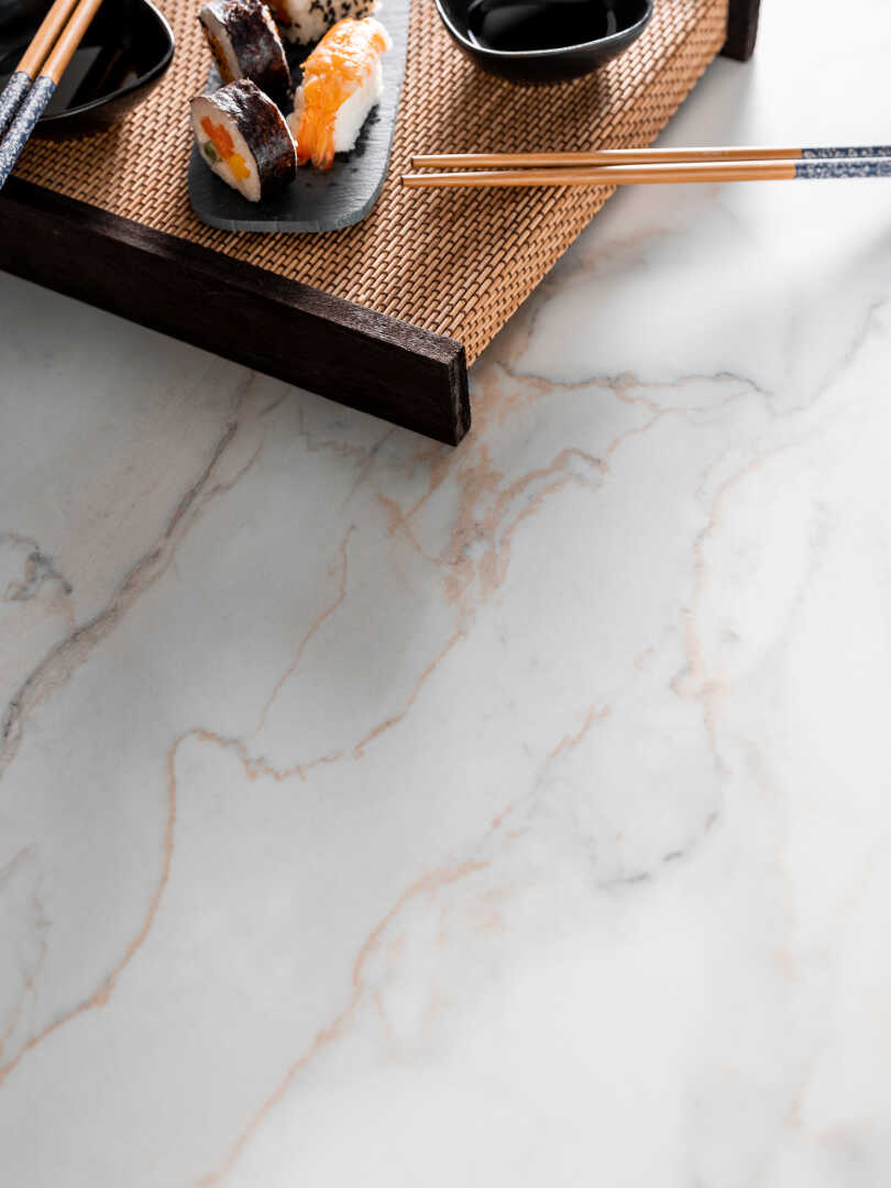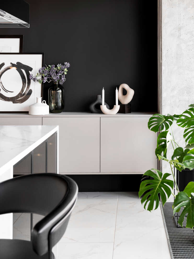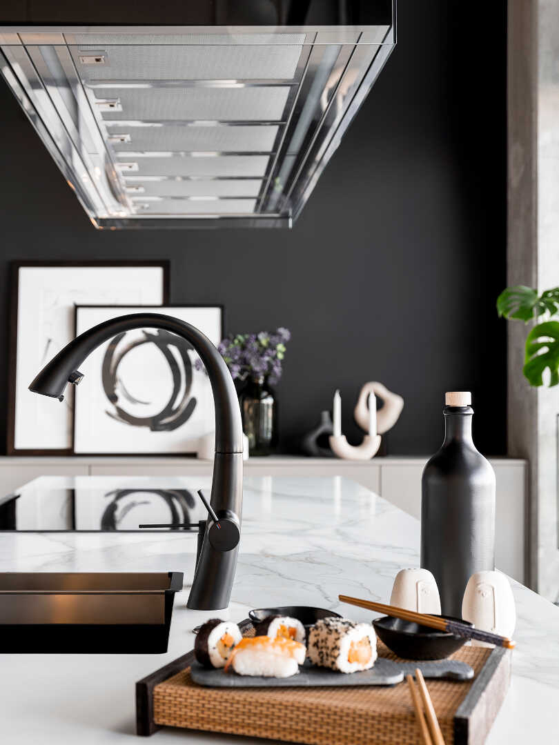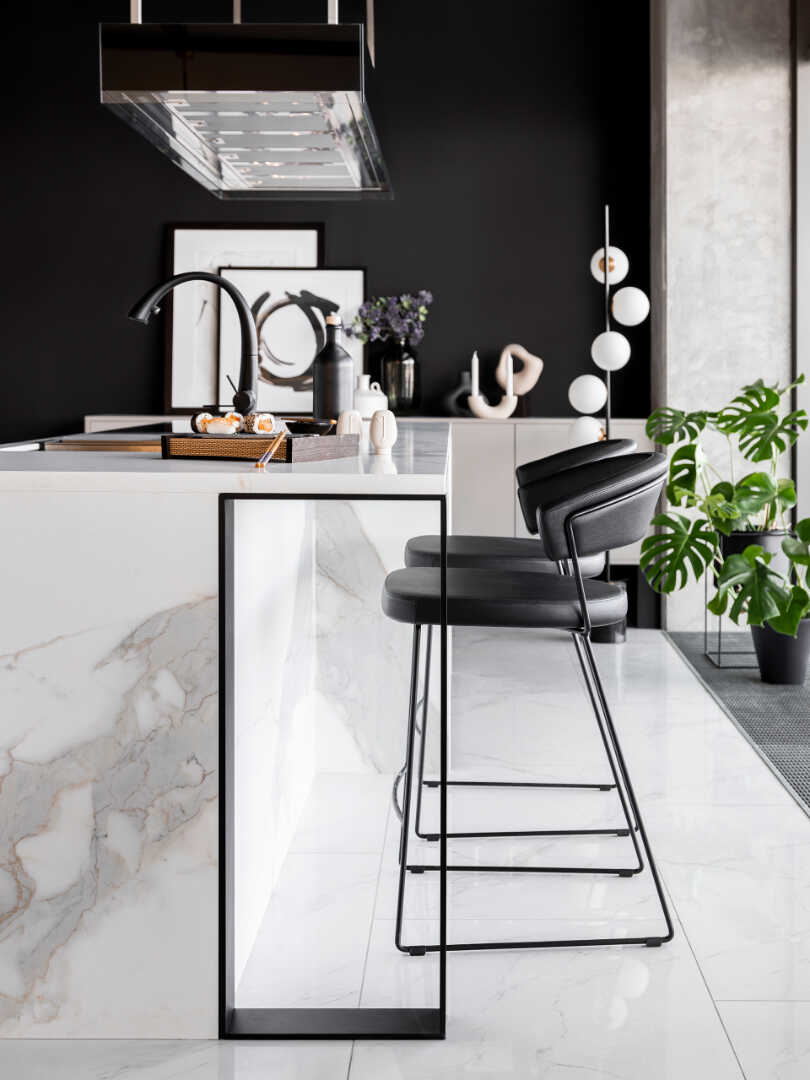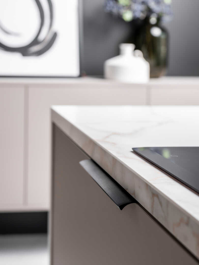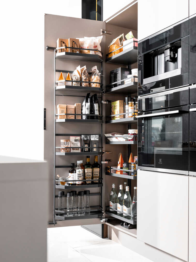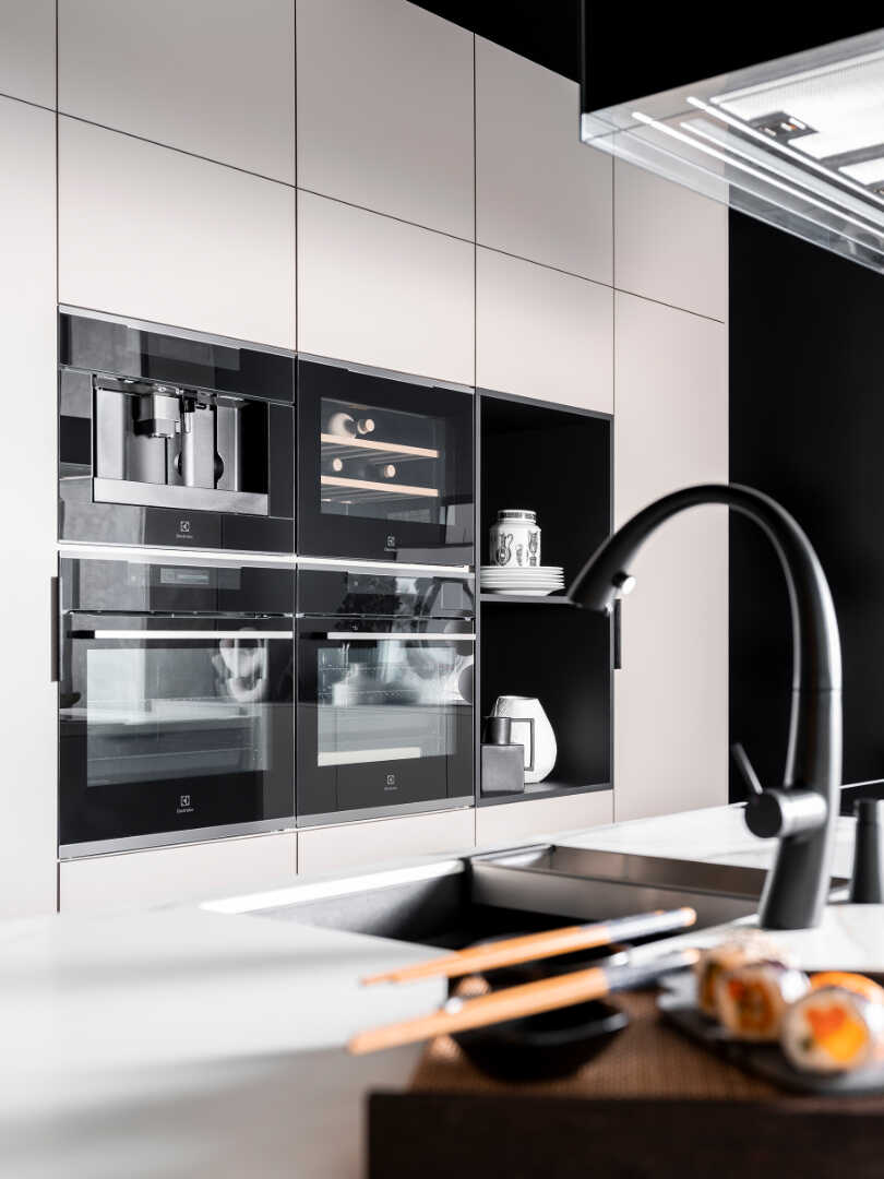 Duża, czysta przestrzeń pomieszczenia została zaaranżowana wysokimi szafami oraz centralnie umieszczoną wyspą, pełniącą rolę podstawowego blatu roboczego. Idealnie wkomponowane w bryłę kuchni witryny, elegancko prezentują ich wnętrze, dając jednocześnie łatwy i szybki dostęp do całej zawartości, a wysokiej klasy sprzęt AGD zawsze jest w zasięgu Twojej ręki.