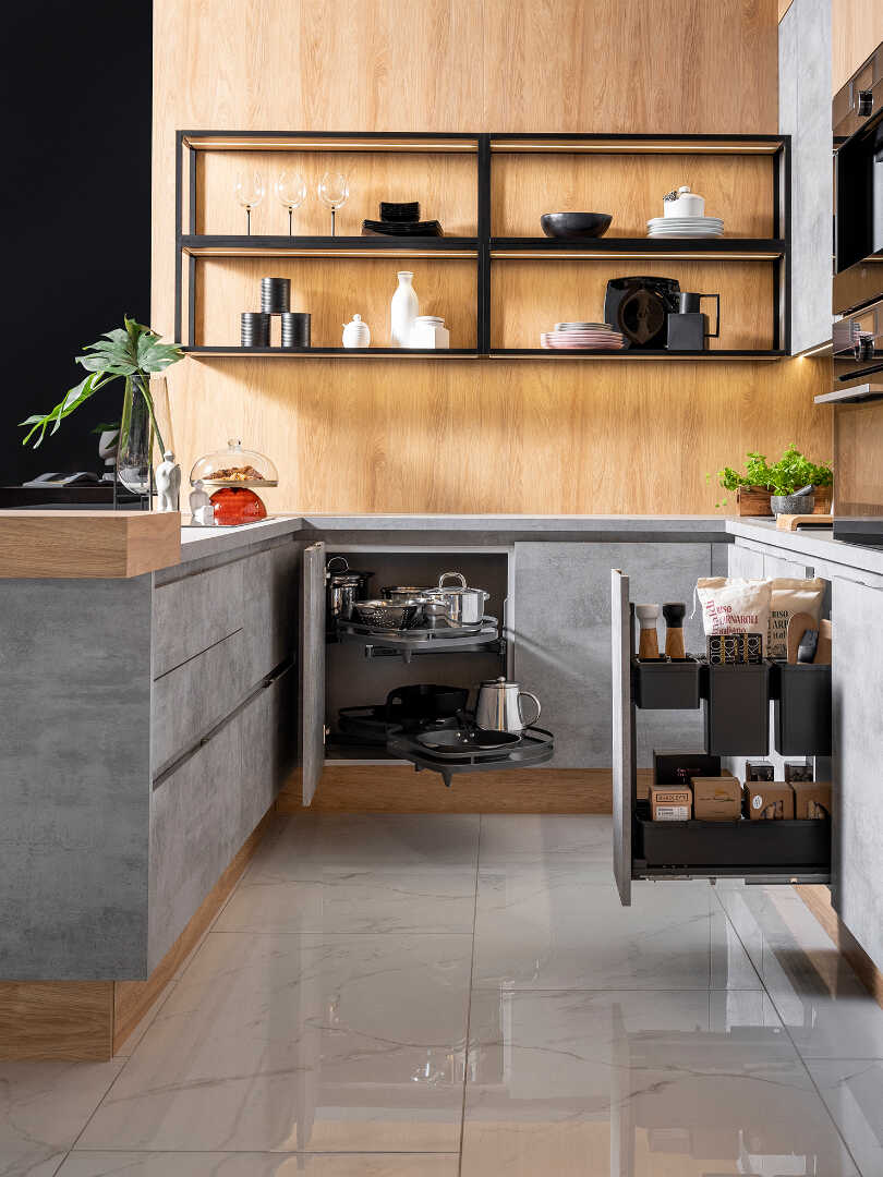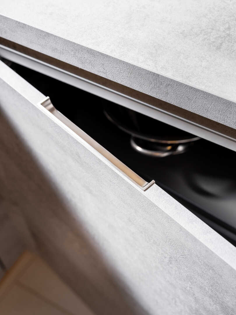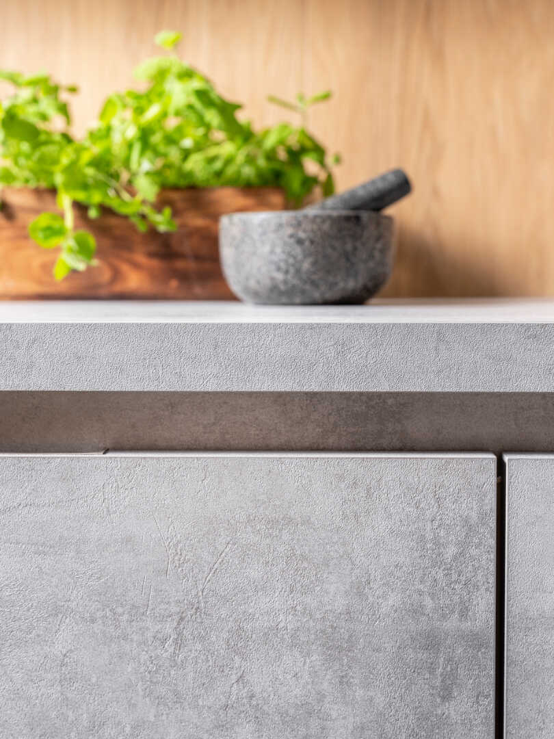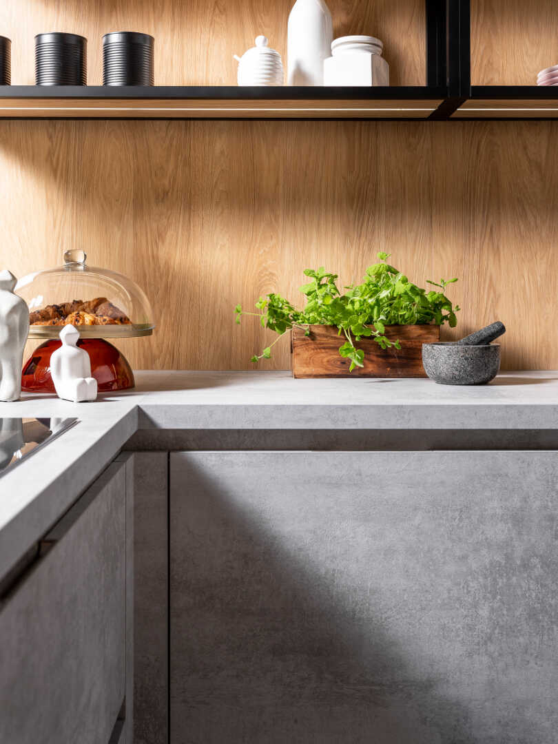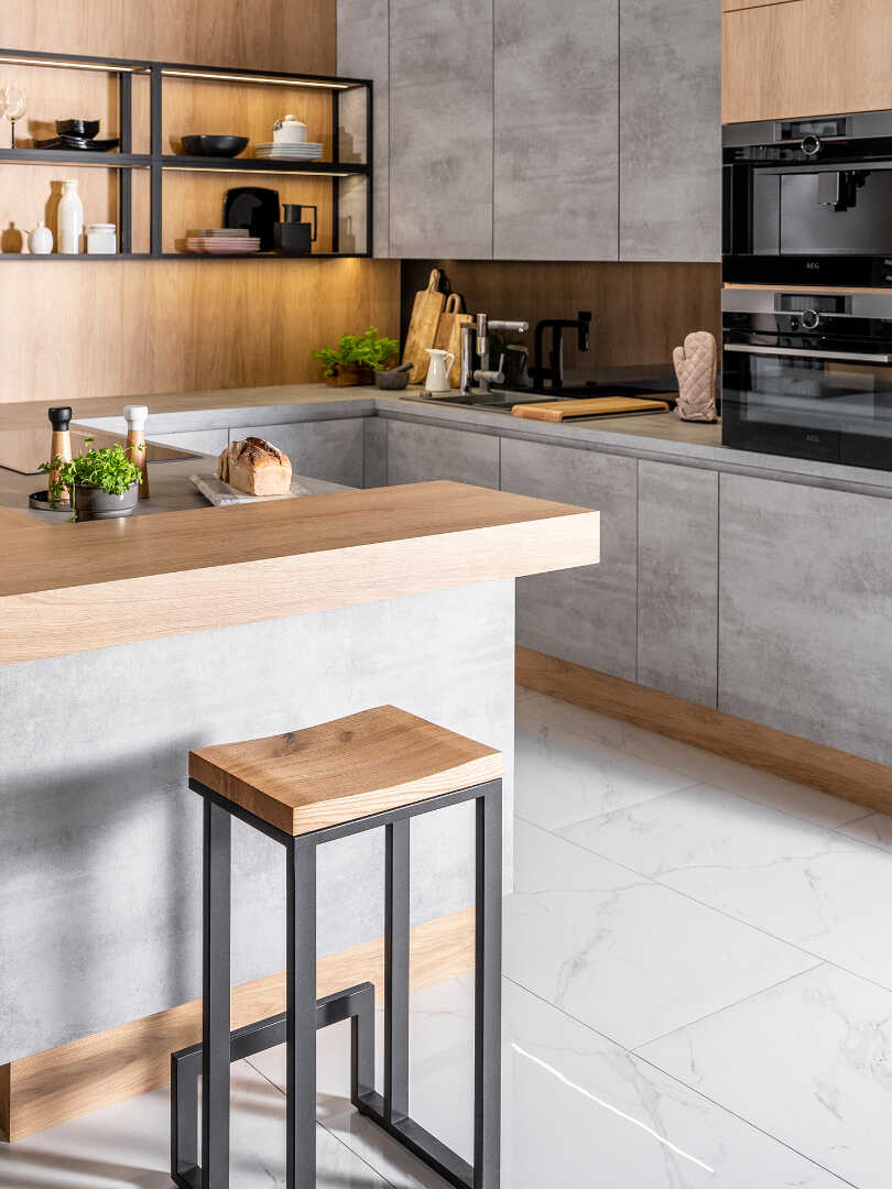 Betonowe fronty szafek, nadają kuchni industrialnego charakteru, będąc w kontraście z drewnianymi elementami, rozświetlającymi całe wnętrze. W masywnej lecz doskonale przemyślanej konstrukcyjnie wyspie, znajdziesz przestrzeń na akcesoria kuchenne oraz szereg sprytnie wkomponowanych półek. Całości dopełnia stylowa, industrialna półka wisząca, która daje Ci dodatkowe miejsce na ustawienie akcesoriów dekoracyjnych.
