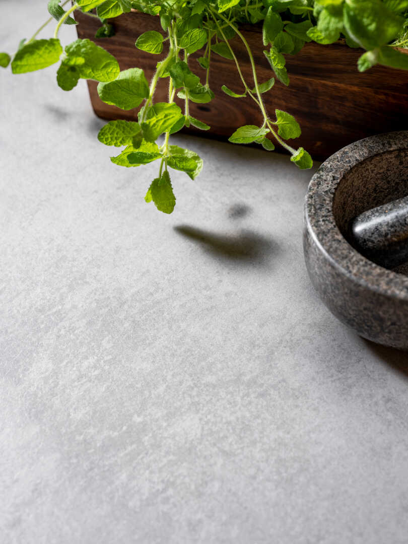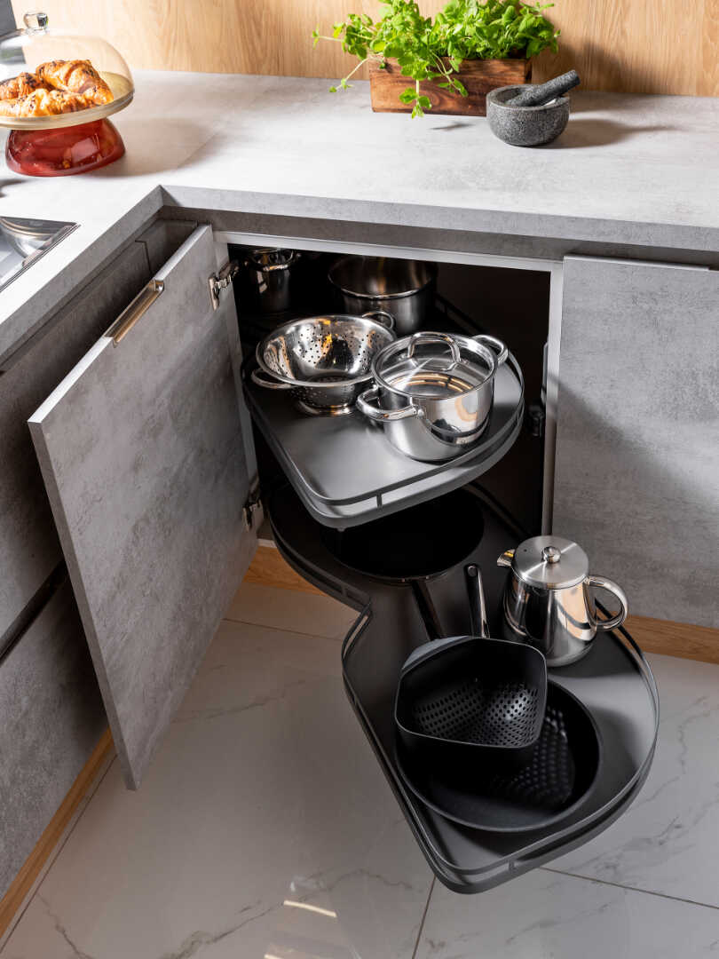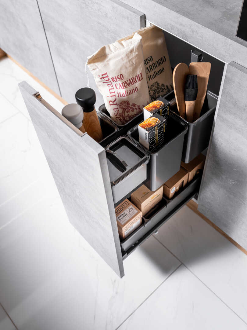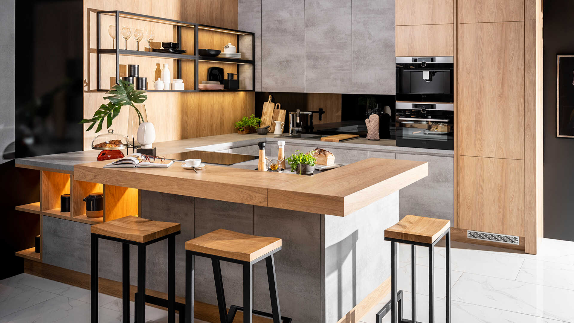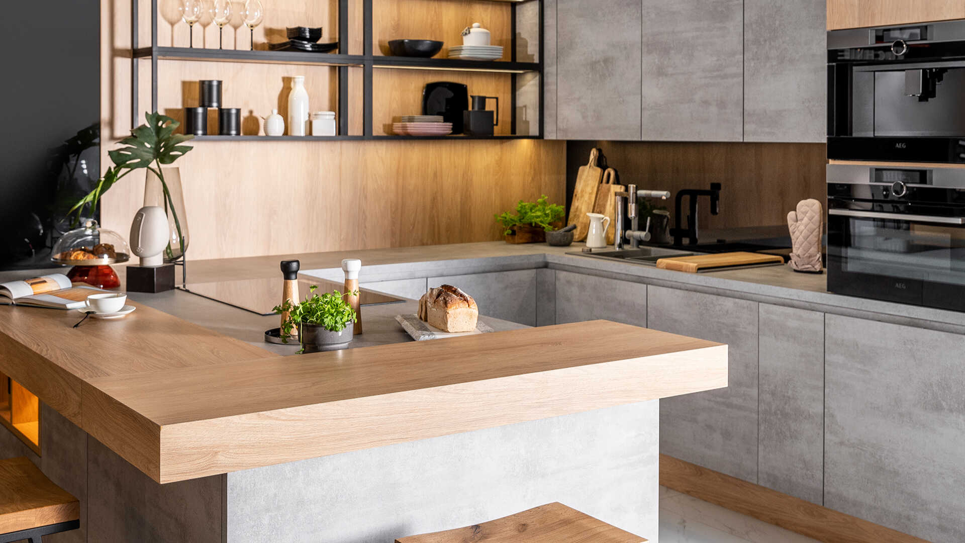 Betonowe fronty szafek, nadają kuchni industrialnego charakteru, będąc w kontraście z drewnianymi elementami, rozświetlającymi całe wnętrze. W masywnej lecz doskonale przemyślanej konstrukcyjnie wyspie, znajdziesz przestrzeń na akcesoria kuchenne oraz szereg sprytnie wkomponowanych półek. Całości dopełnia stylowa, industrialna półka wisząca, która daje Ci dodatkowe miejsce na ustawienie akcesoriów dekoracyjnych.